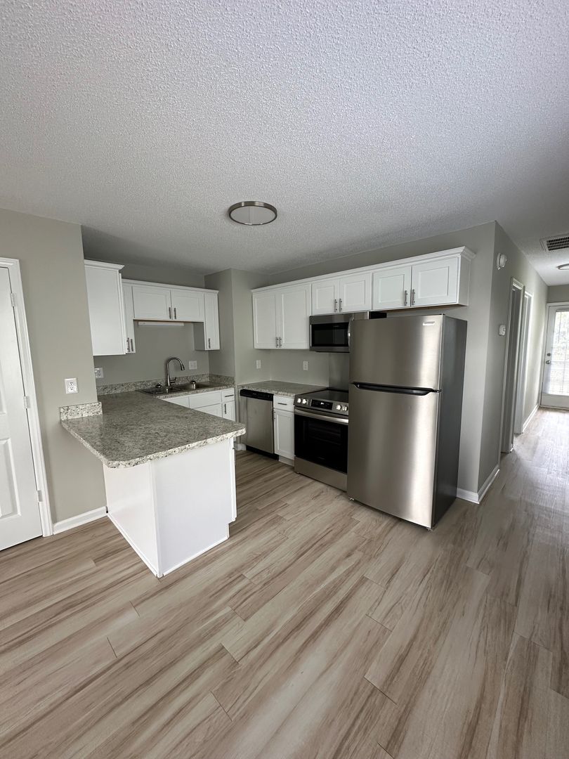 The updates include new white cabinets with brushed silver pulls, new countertops, and stainless steel appliances and plumbing fixtures provide a modern look. Luxury Vinyl Plank flooring in the common areas and carpets in the bedrooms compliments the kitchen upgrades and makes for easier upkeep!