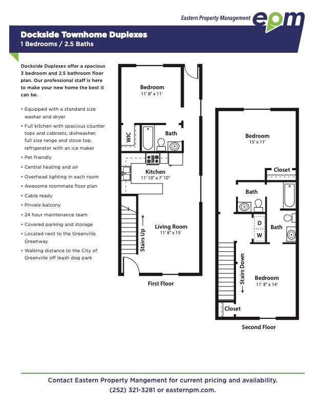 Dockside duplexes offer a spacious 3 bedroom and 2.5 bathroom floor plan which includes internet. Our professional staff is here to make your new home the best it can be. Stop by or give us a call at (252) 321-3281.