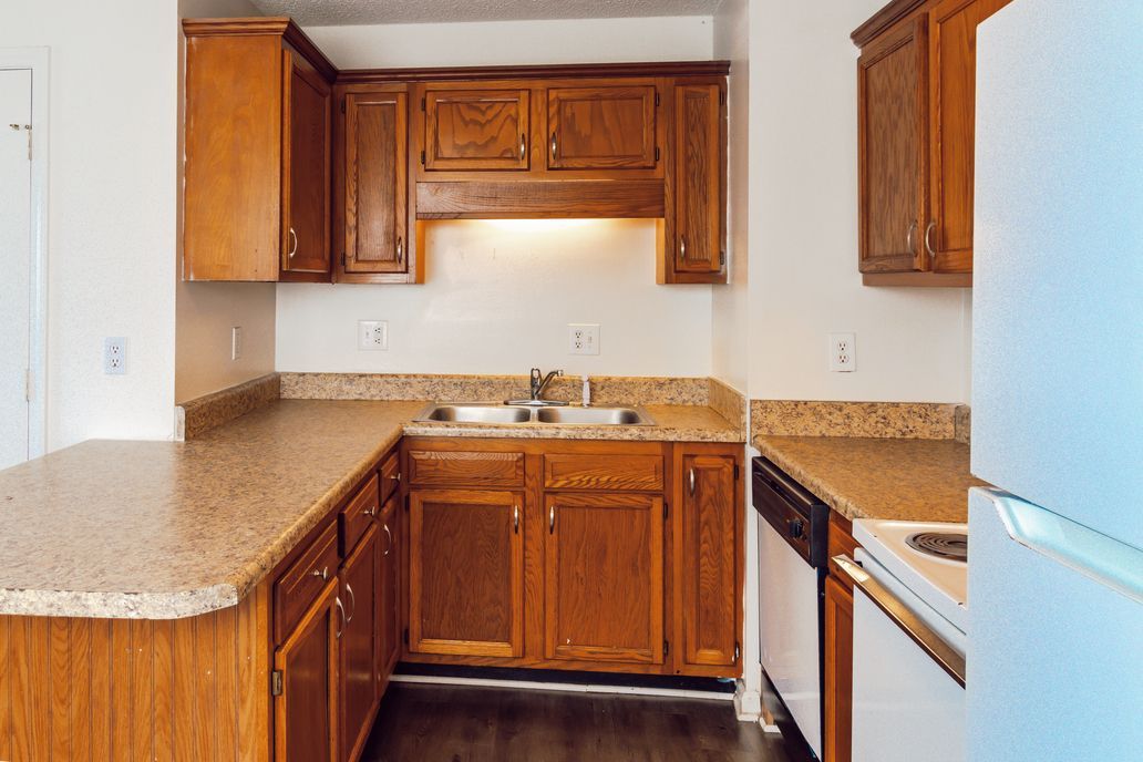 Full kitchen with spacious counter tops and cabinets, dishwasher, full size range and stove top, refrigerator with an ice maker