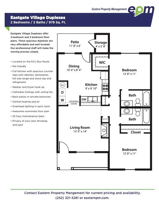 Eastgate Village Duplexes offer pet-friendly 2 bedroom and 3 bedroom floor plans. Our professional staff will make the moving process simple! Stop by or give us a call at (252) 321-3281 ext. 1