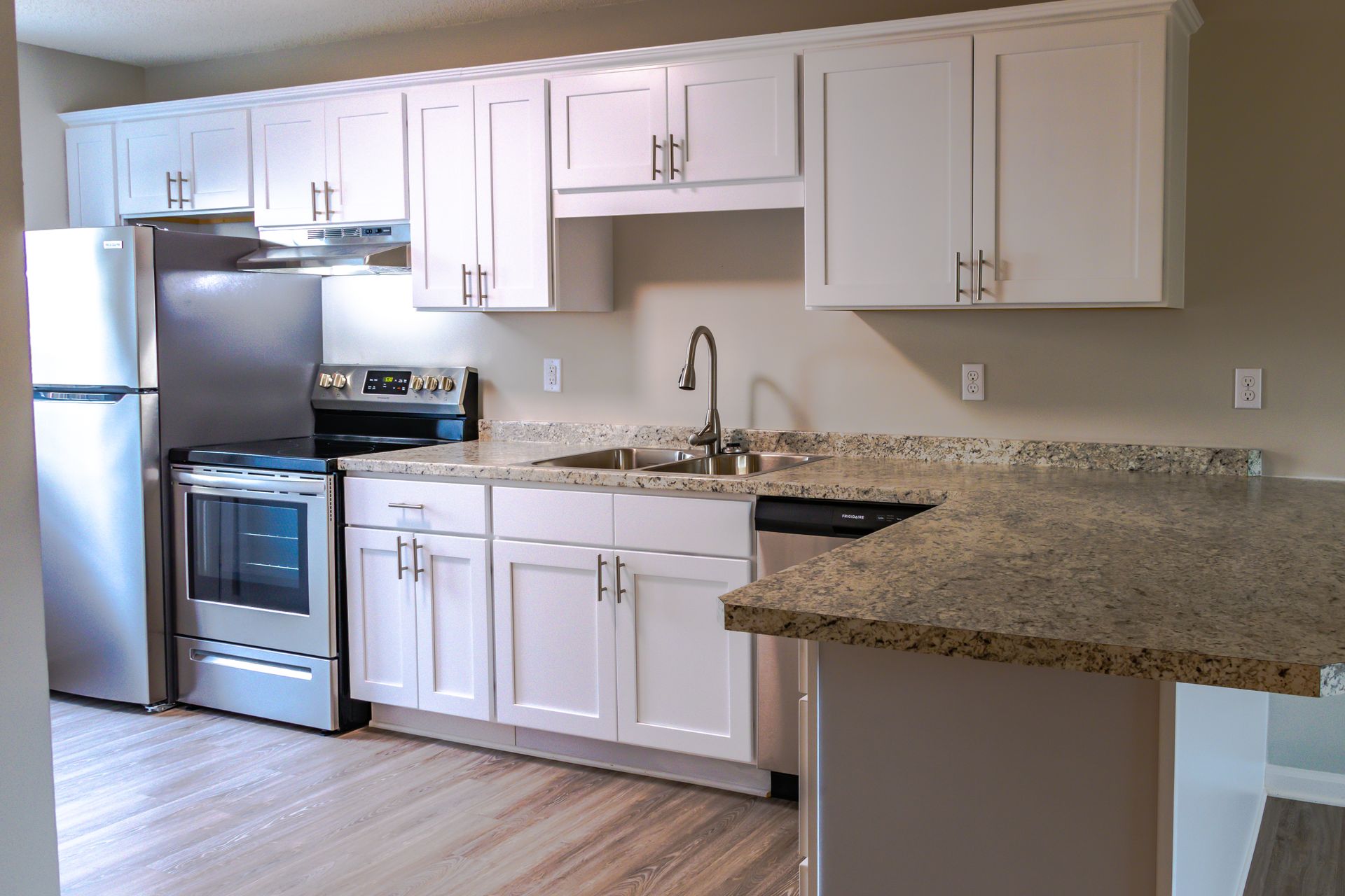 Renovated with new cabinets, countertops, stainless appliances, stainless plumbing fixtures, modern light fixtures, and vinyl plank flooring.