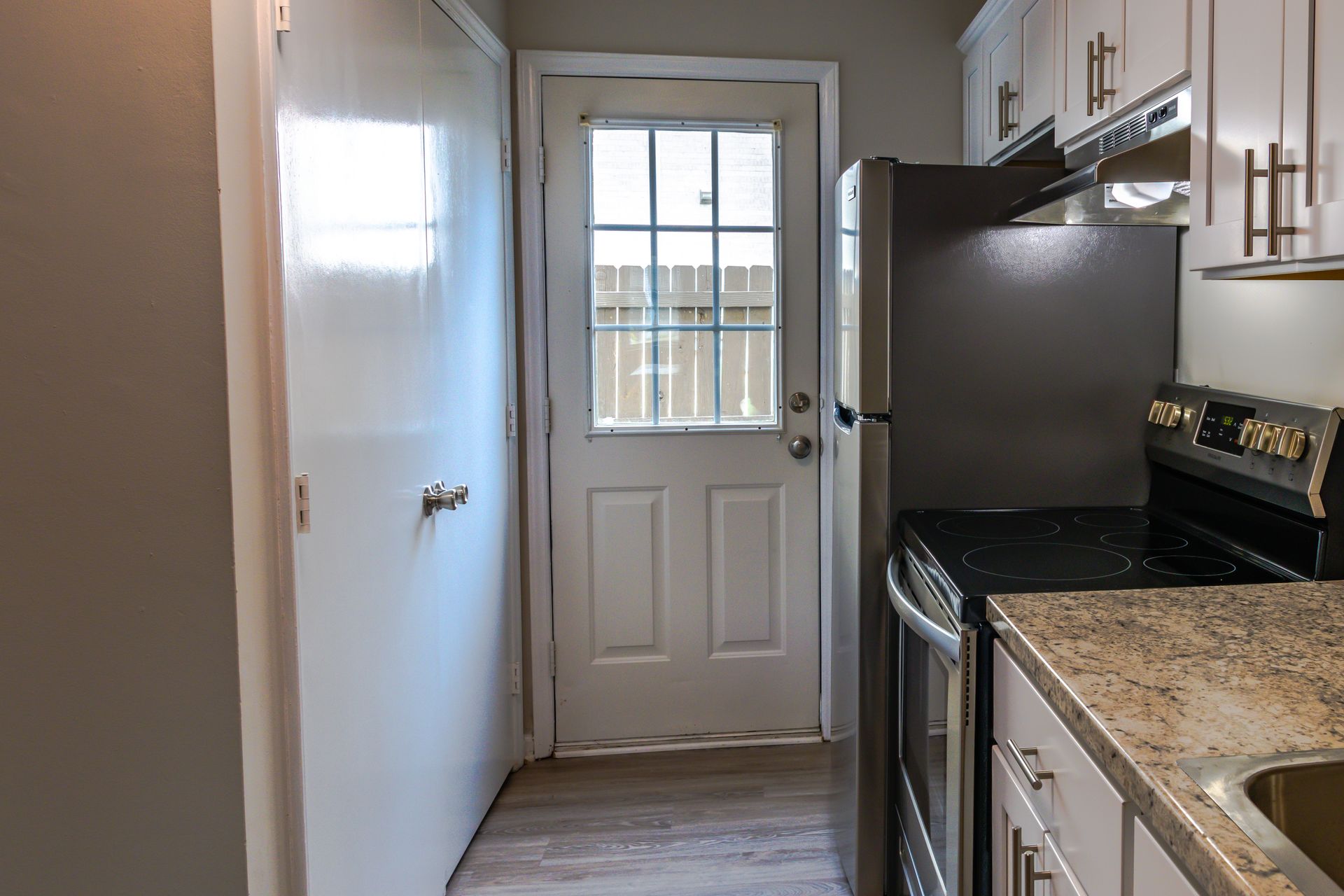 Renovated kitchen with spacious counter tops and cabinets, dishwasher, full size range and stove top and refrigerator